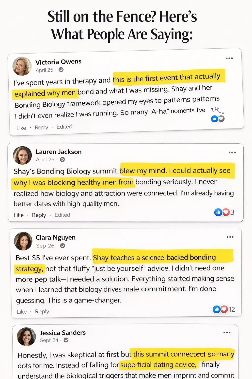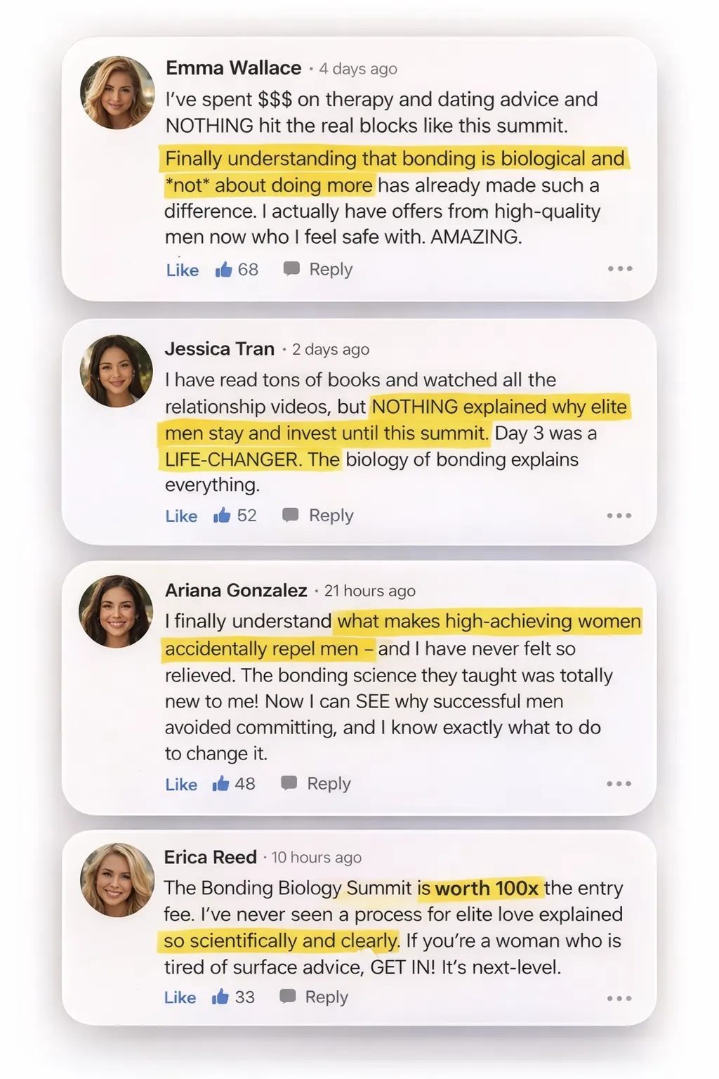 A: Many women report instant clarity and pattern shifts within days. The actual bonding acceleration happens in real life after implementation.